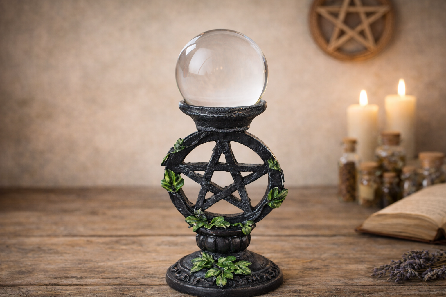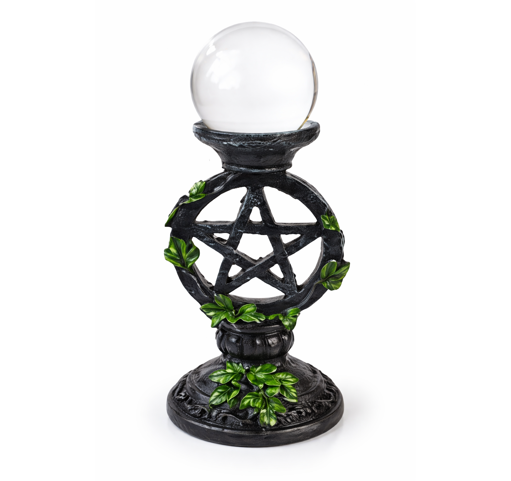 The 50mm crystal gazing ball sits on a beautifully detailed pentagram stand with an aged dark finish and vibrant green ivy wrapping around the frame. It looks like something that’s been on a practitioner’s altar for years – in the best possible way. The kind of piece people notice when they come into your space and ask about.