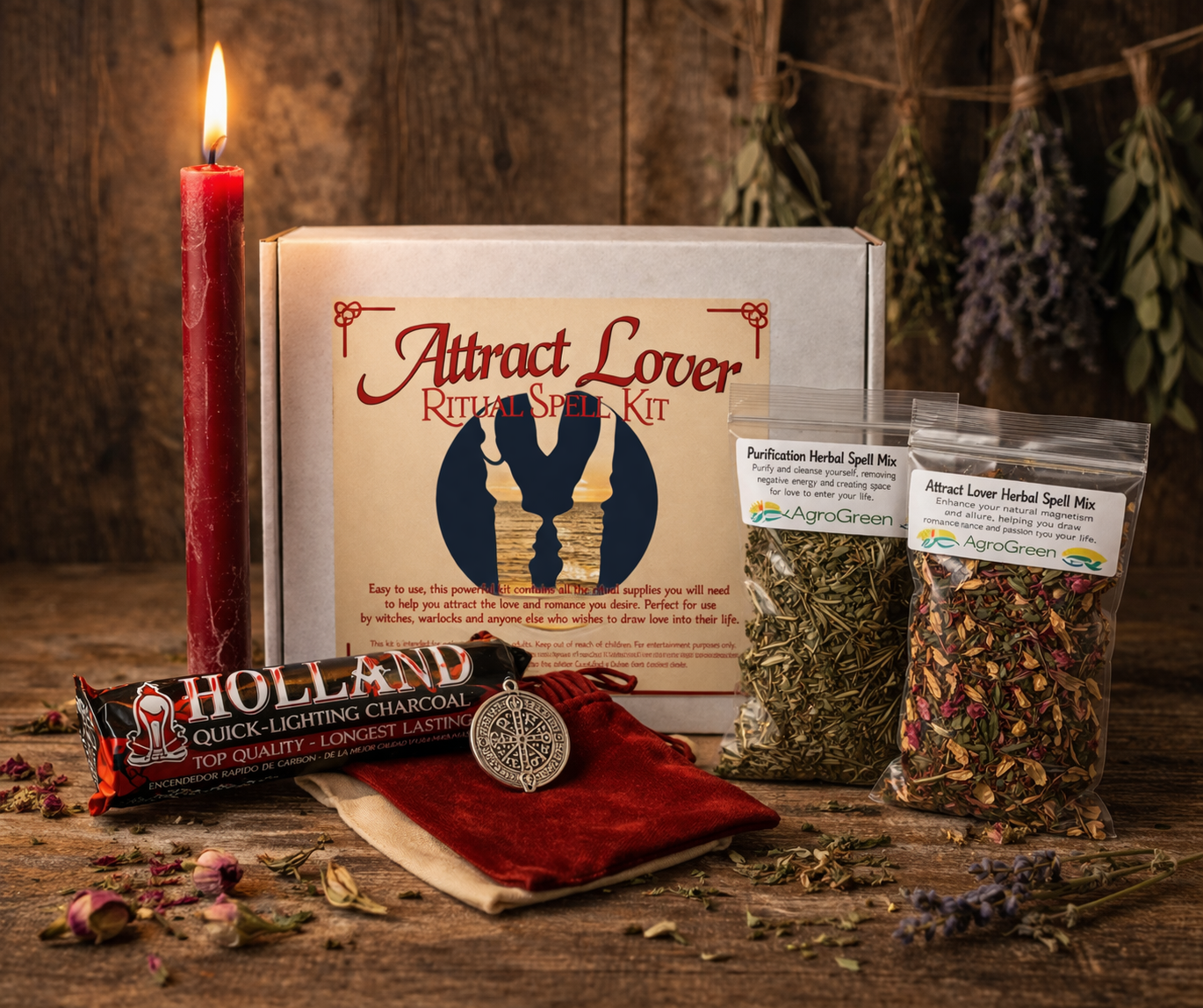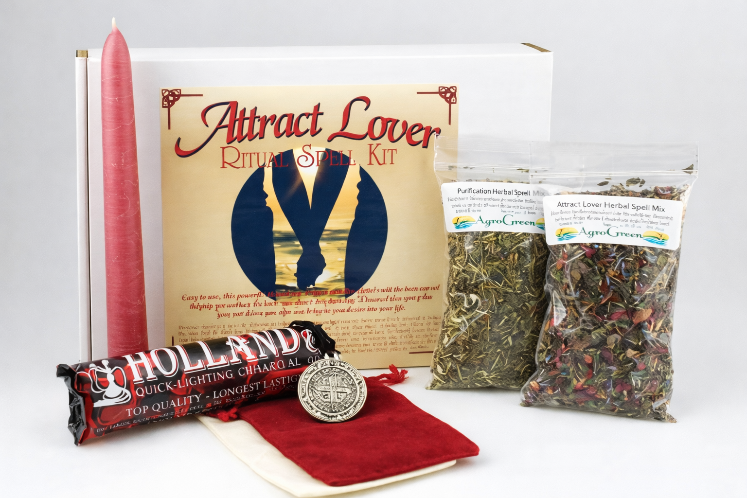 Inside the kit you’ll find a candle ritually charged with runes to draw your ideal lover, an attract love herbal spell mix, a magickal amulet engraved with a seal to pull your perfect match toward you, charcoal briquettes, two pouches and full step-by-step instructions. Every single item has been purpose-made for this working and ritually blessed before it reaches you. You’re not throwing together random candles and hoping for the best. You’re working with a complete, intentional ritual system built specifically for love attraction.
